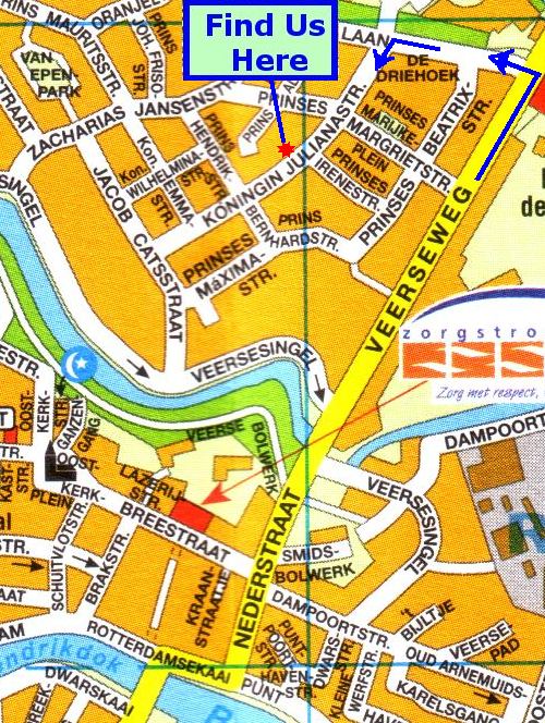 Vlissingen take the first exit signed Middelburg and Follow on into Middelburg until you come to a railway crossing, follow the road over the bridge which is right after the crossing and take the first right, by the traffic lights directly after the bridge. Follow this street to the end (a T junction) and turn Left. straight on and cross the bridge you can only go right, follow right and eventually cross another bridge, follow the road round to the right and then left. carry straight on towards Veere, and take the 3rd road on your left, directly opposite the furniture store and supermarket 'De Boer', the second street on the left is Koningin Julianastraat.. WELCOME........ |